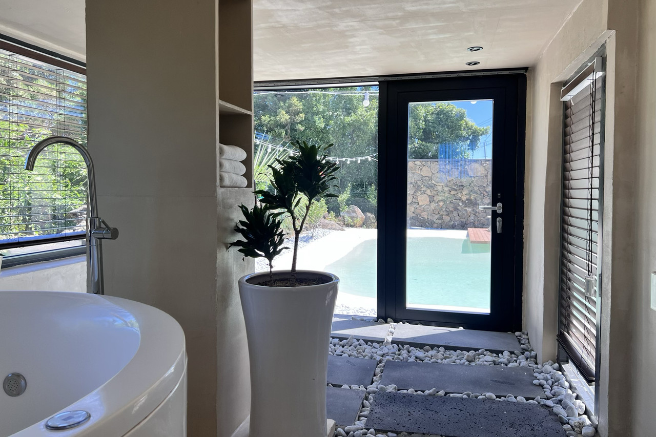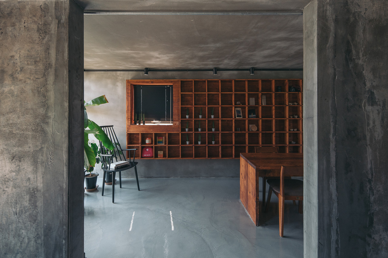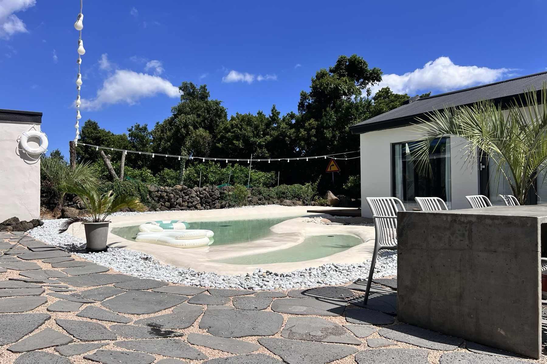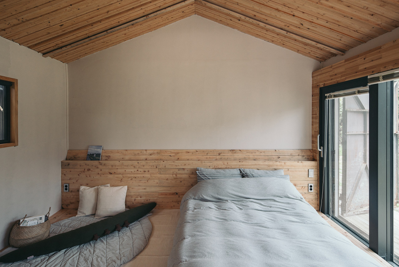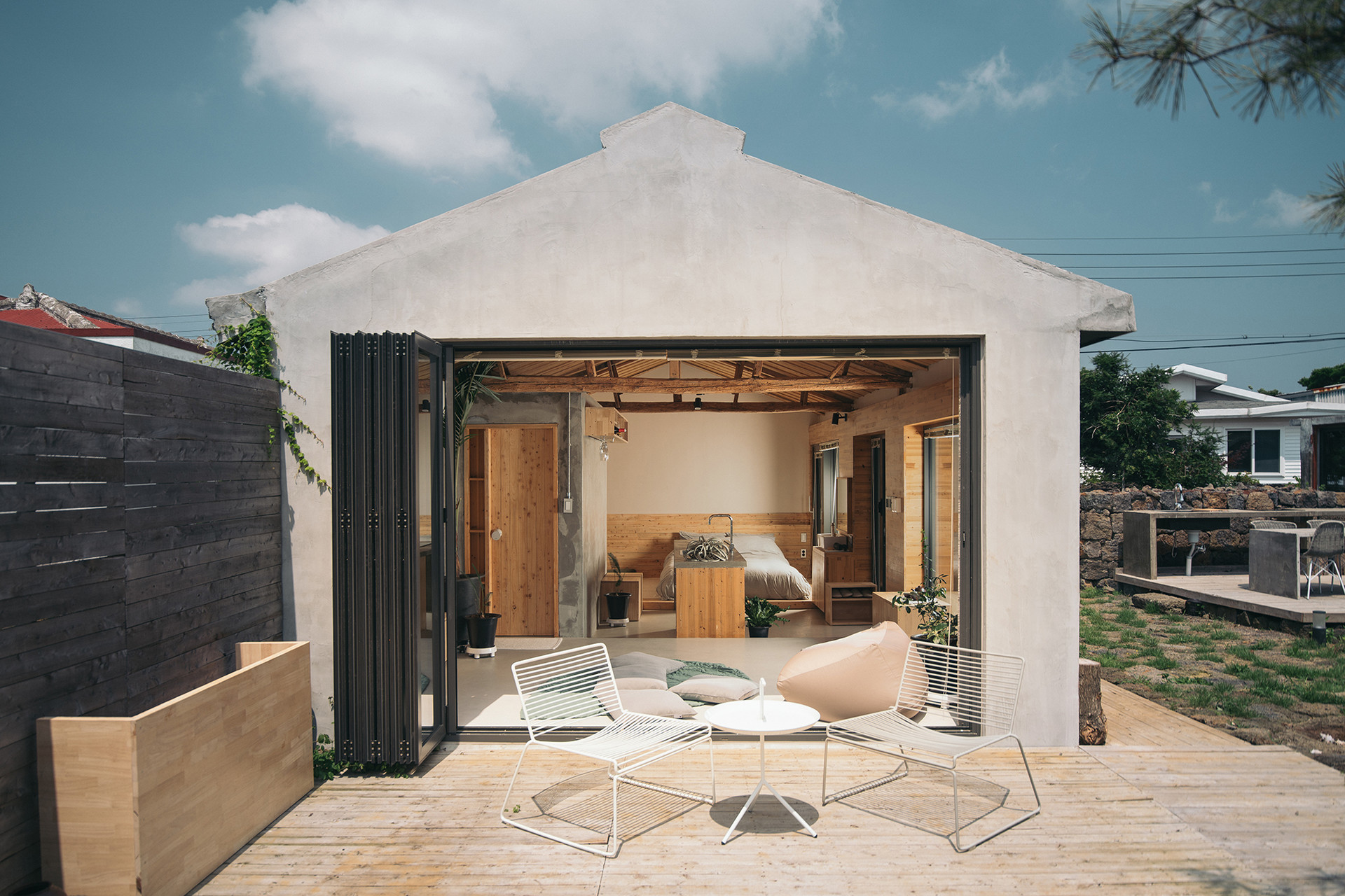 시간의 레이어를 담은 낡은 창고를 개조한 밖거리의 공간은 제주옛집의 안거리- 밖거리 문화를 현대의 감성으로 재해석, 가장작은단위의 소박하고 친환경적인 생활공간으로 재구성하였습니다. 오붓한 저녁의 위로가 될 작은 바, 편백나무향으로 가득한 침실, 곶자왈을 감상하며 담소를 나누는 작은 티룸이 오픈플랜으로 구성되어 있고, 데크정원으로 향한 폴딩도어를 열면 안밖의 경계를 넘어 펼쳐지는 귤밭과 곶자왈의 시공간을 온전히 만끽하실 수 있습니다.